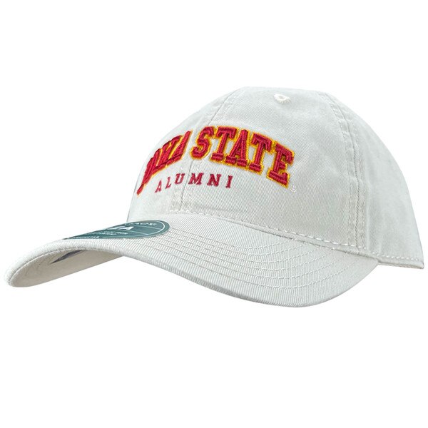 This sand colored unisex hat with adjustable back buckle for easy sizing features a 3D “Iowa State” in cardinal and gold raised block letters arched across the front with “Alumni” in cardinal block letters underneath.